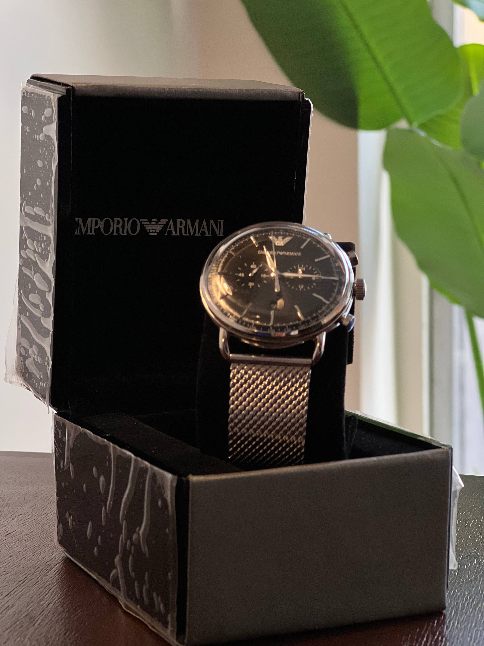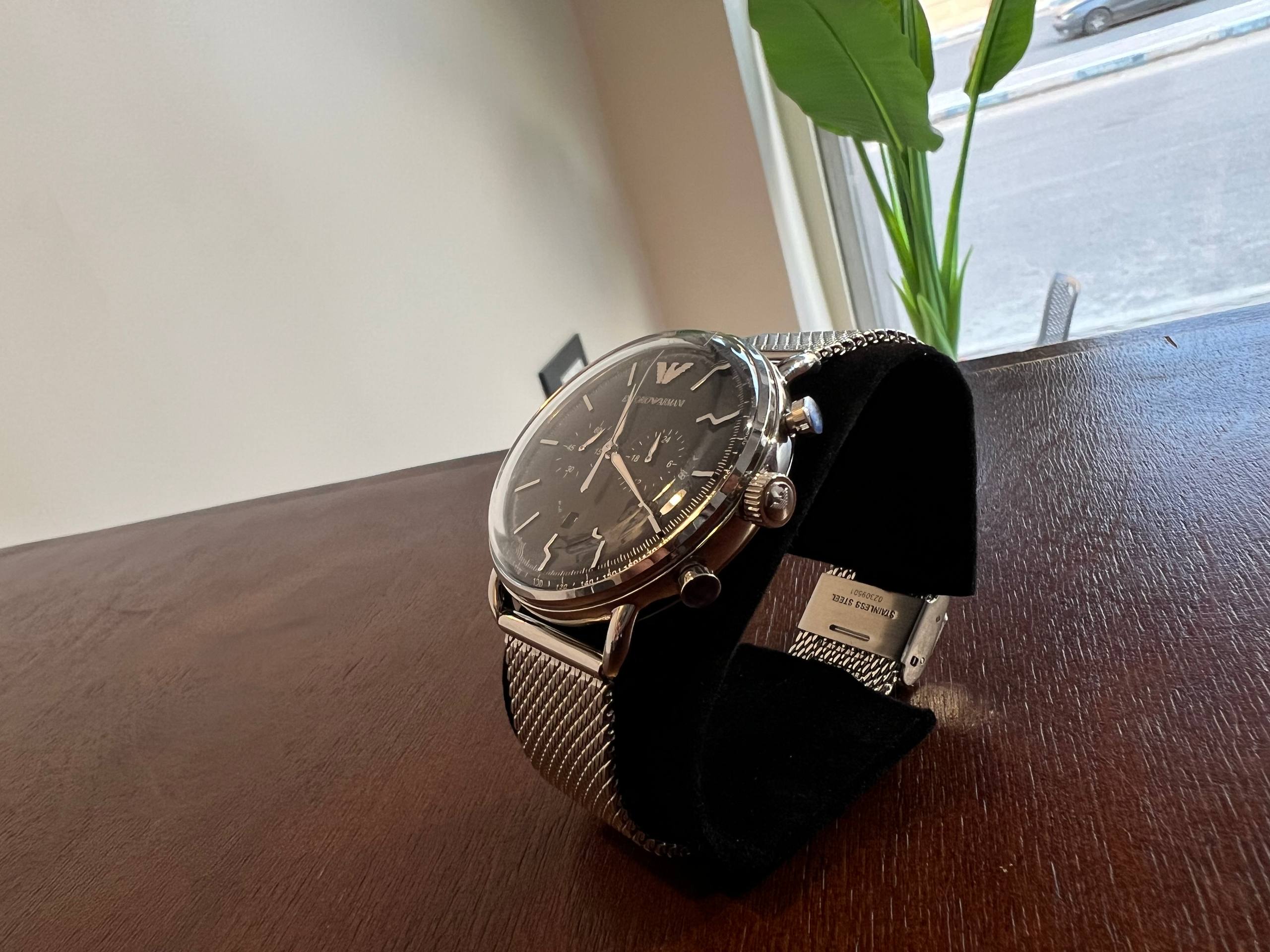 Emporio Armani Classic Chronograph, Stainless Steel Model with a black dial and mesh bracelet.