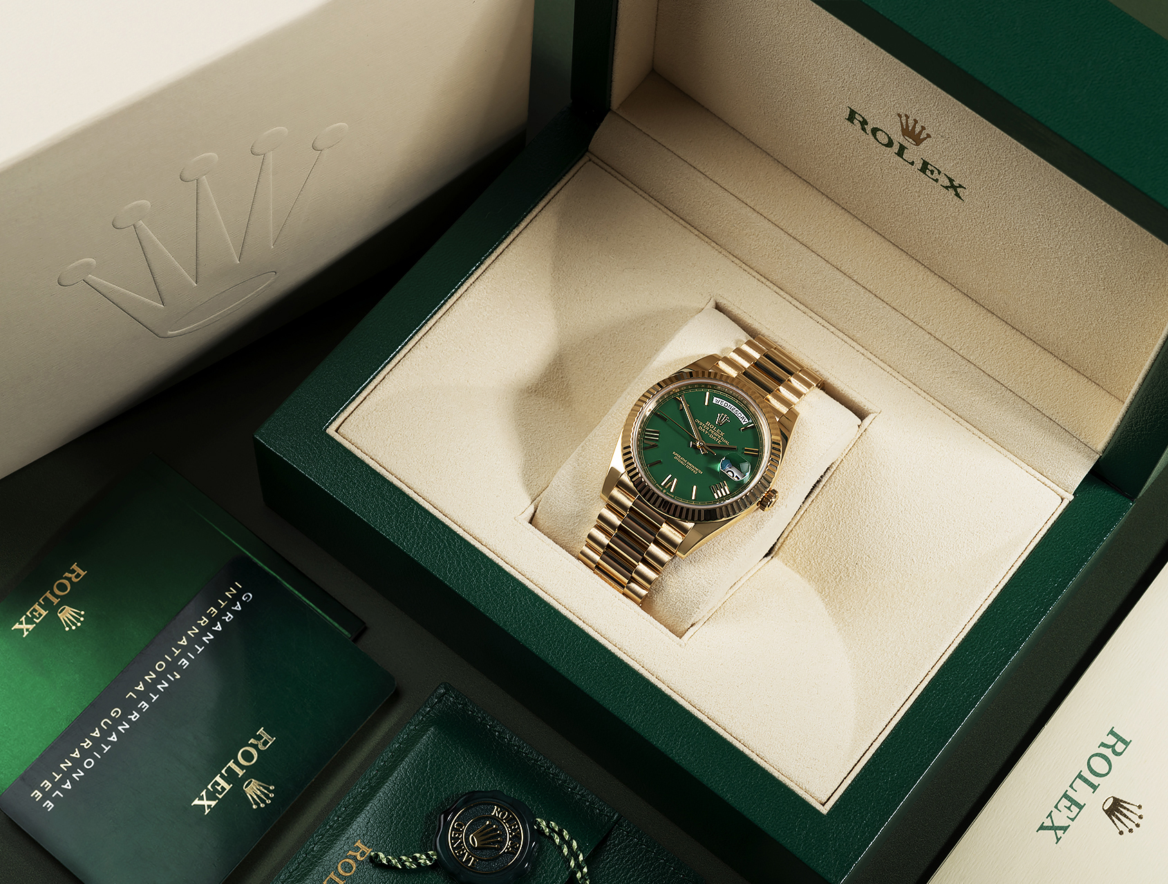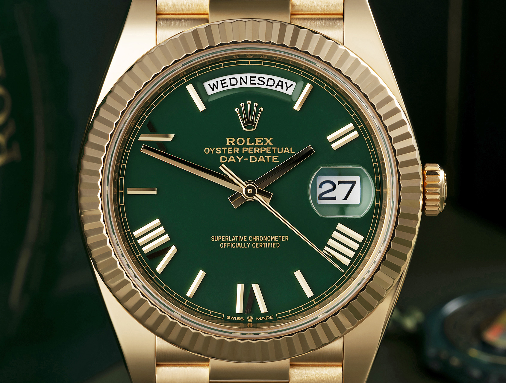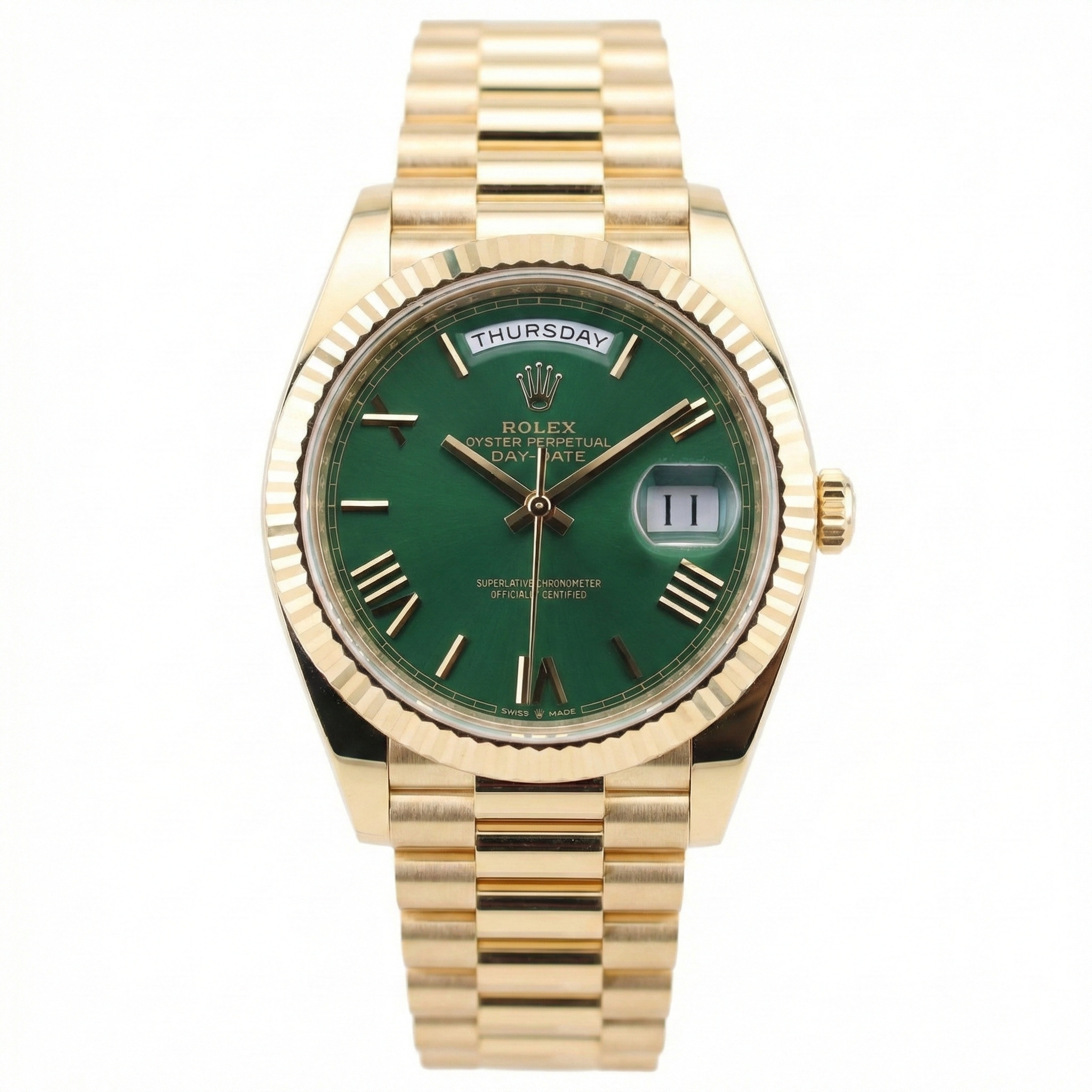 Rolex Day-Date 40 the Yellow Gold Model with a Green dial and President bracelet.