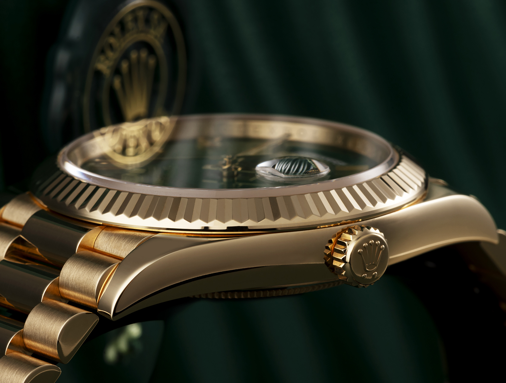 Overview: The aesthetic is defined by the 18 ct Yellow Gold architecture, which offers a classic, radiant warmth that stands in sharp contrast to the deep, glossy Green Lacquer dial. The deconstructed Roman numerals are faceted and applied by hand, catching the light with every movement. This is the definitive “President” configuration—heavy, substantial, and historically associated with global leadership.