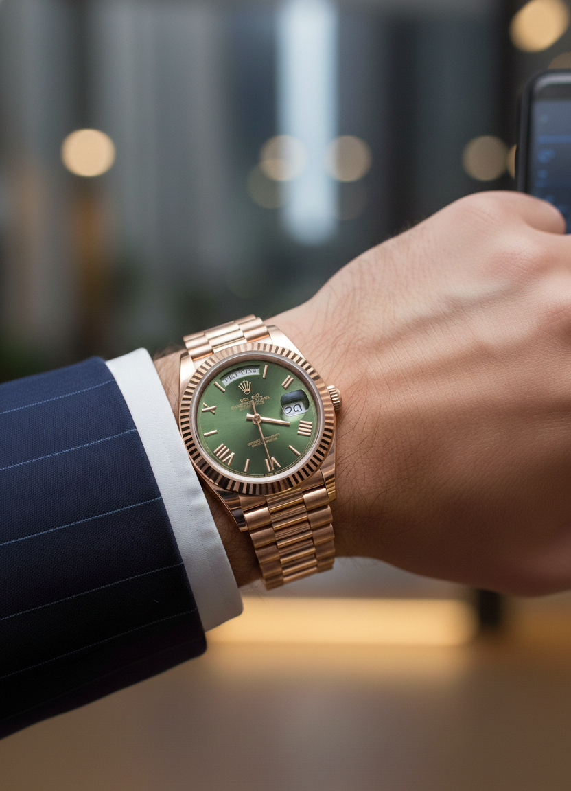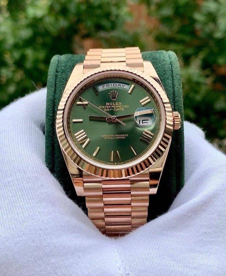The Ultimate Symbol of Success and Refinement. This timepiece captures the prestige of the “President’s Watch,” a design famous for its dual-calendar display and world-class presence. Featuring a distinctive sunray olive green dial and a warm rose gold-tone finish, this model offers a modern and vibrant twist on a timeless classic.